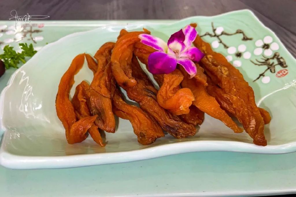 说实话,这时我来永嘉出差的几天里,摆盘最精致的一餐。浅绿釉的瓷器造型各异,有的还在边角印着几枝梅花,第一眼看去就给人带来不失典雅的高级感。所以哪怕是简简单单的几根地瓜干,这时候看起来也是颇具格调。