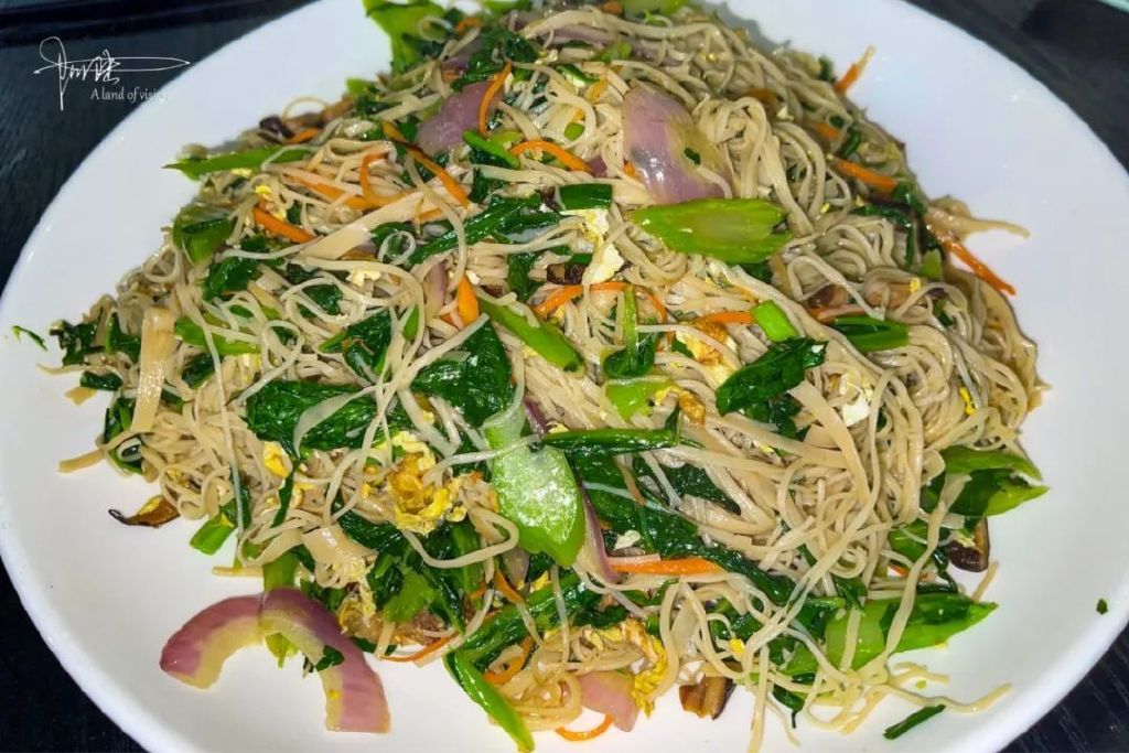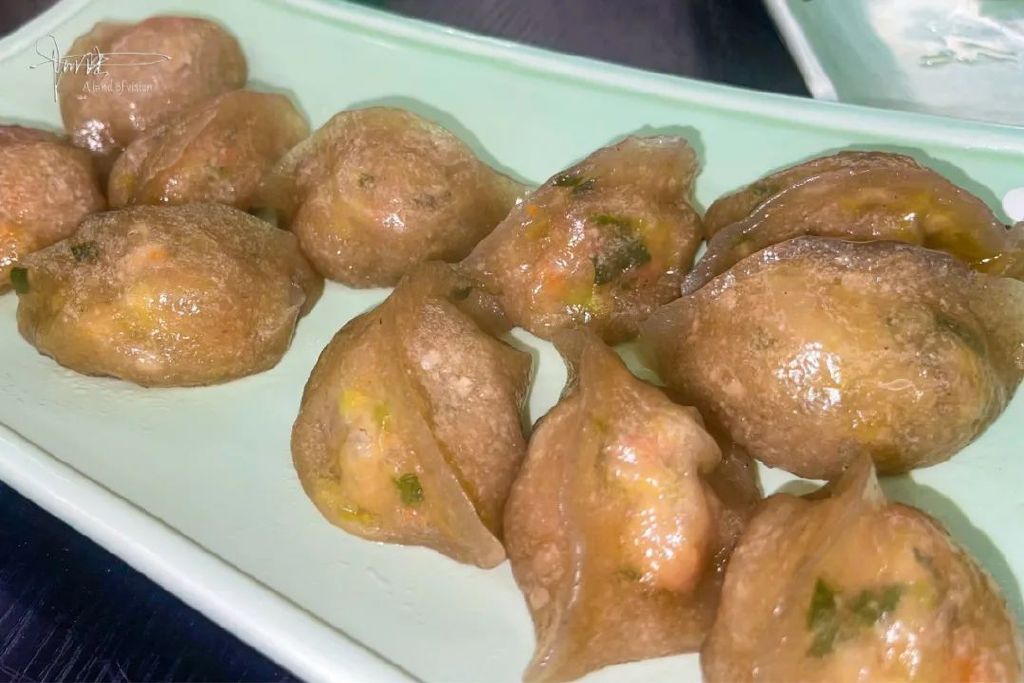 炒素面是楠溪江很常见的主食,其实跟我们平时吃的炒粉干差不多,但是各个店家或者厨师都有不同搭配,所以口味虽然总体差不多,但还是有些差异的。锦粉饺也一样,外观虽大致相同,里面的馅料同样因店而异,因人而异。有趣的是正因为这俩“兄弟”,此次楠溪江之旅似乎都没吃什么米饭。