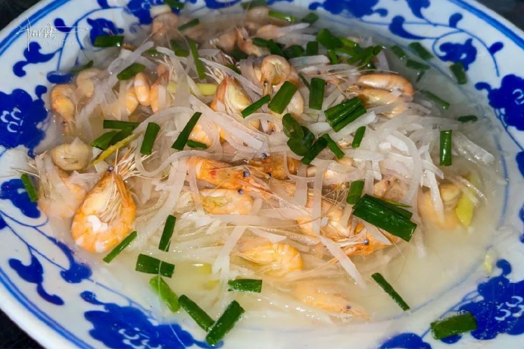“冬吃萝卜夏吃姜”,把晶莹剔透的白萝卜丝和新鲜白虾炒在一起,是道既营养又美味的时令菜。因为虾不大,皮就很薄,所以我就连壳吃了几只,别有一番风味。如果你比我还糙,可以连头吞,哈哈。
