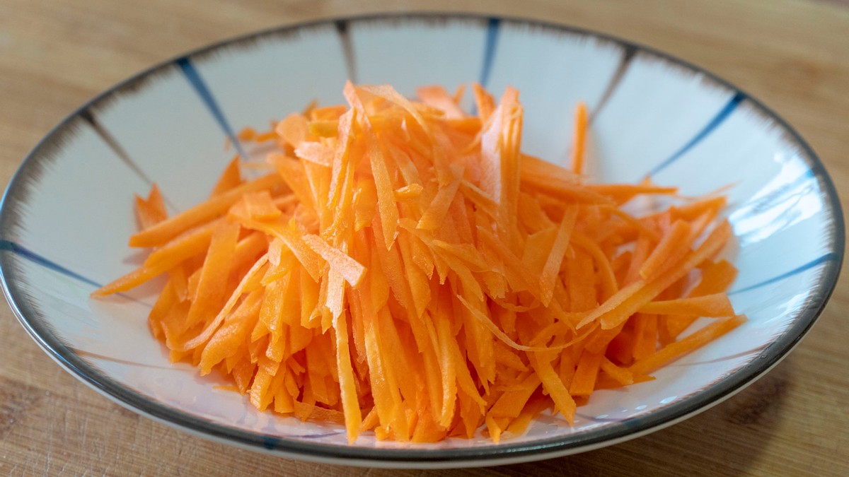 步骤2、胡萝卜刮皮后洗净切成细丝,装在盘中备用。