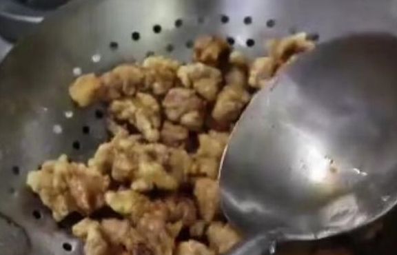 4、油锅内下入腌渍好鸡块进行炸制,至鸡块外表金黄、肉质成熟时捞出沥油待用;