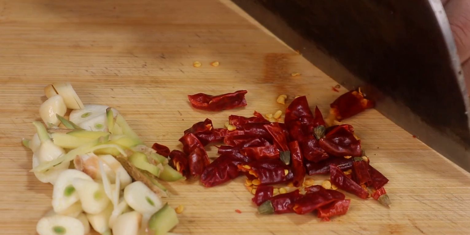 4、把准备好的大蒜取出来,去皮,然后切片,切完片之后咱们再来切一下生姜,生姜切成生姜丝就可以了。接下来咱们将干辣椒切一下,把干辣椒切成小段装盘备用,然后放入花椒,接下来就可以起锅烧水了。