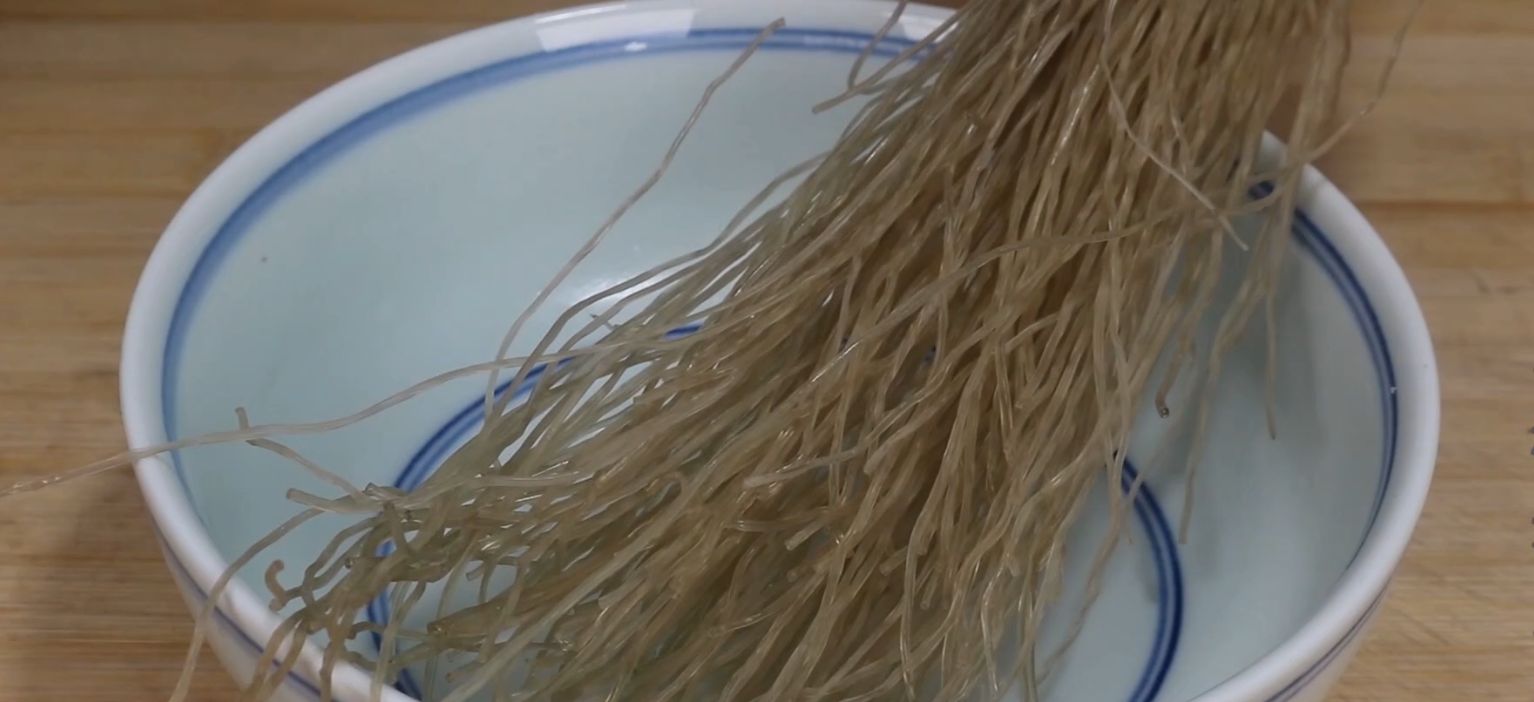2、咱们最先要处理的是粉丝,将粉丝取出来放在大碗中,加入适量的开水泡发一下,粉丝中加入开水之后它立马就会软了,但是里面还是硬的,所以需要将它们搅拌均匀,让粉丝彻底浸泡入水中,浸泡10分钟,直到泡到完全变软。