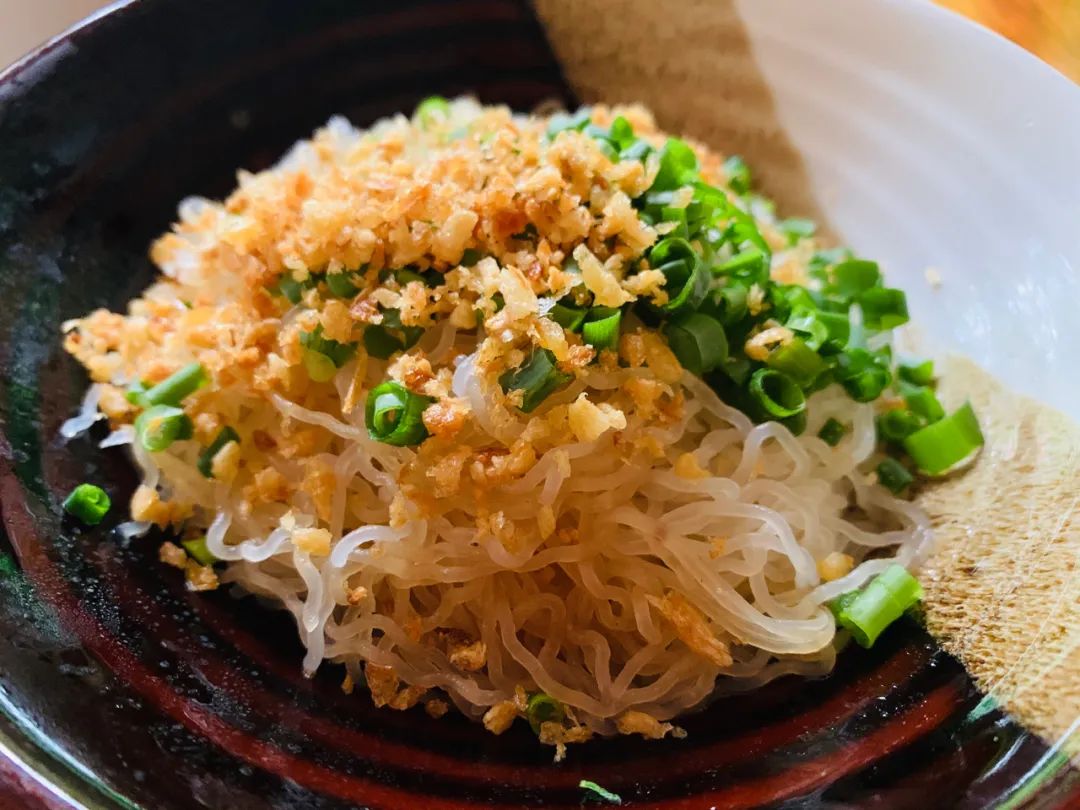 腌面的面条是碱水面,再拌上猪油、香脆的蒜粒、葱花和鱼油,看起来平平无奇,入口却越嚼越香、油润咸鲜,令人回味无穷。