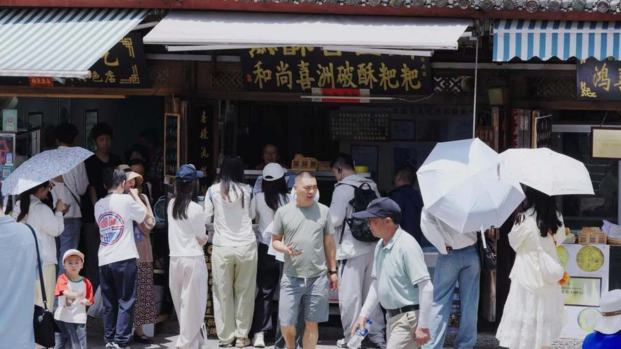 7月2日,杜方明家的喜洲粑粑店外,消费者排队等候。新华社记者丁怡全 摄