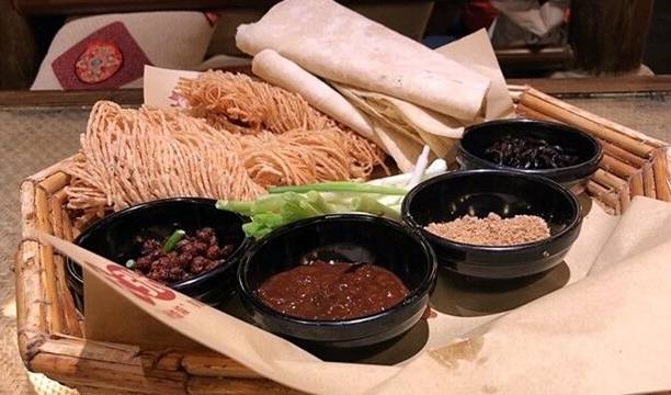 徐州的烙馍村,这里是烙馍一条街,可以算是徐州本土的地道美食,这道呈上来只有,你会看到一个盘子上放有四种酱料,若干片烙馍,还有几只由面线炸制而成面线卷,当地人称为馓子。软口滑嫩的烙馍蘸上豆瓣酱、芝麻等酱料,裹上几根馓子,再来点小菜,包裹在团放入嘴中,别提味道有多好了,那种外嫩里酥的感觉,多层次的口感,有点像吃烤鸭,也有点像煎饼果子。