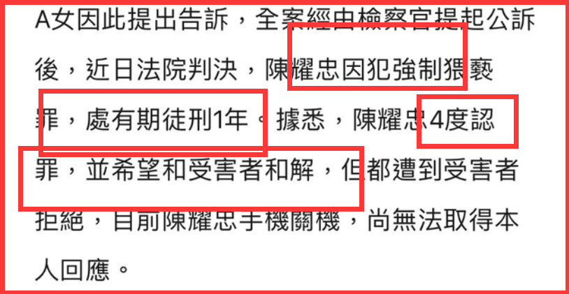事发后,陈耀忠对自己的行为供认不讳,4度请求对方和解,均被受害者拒绝,最终获得裁决。