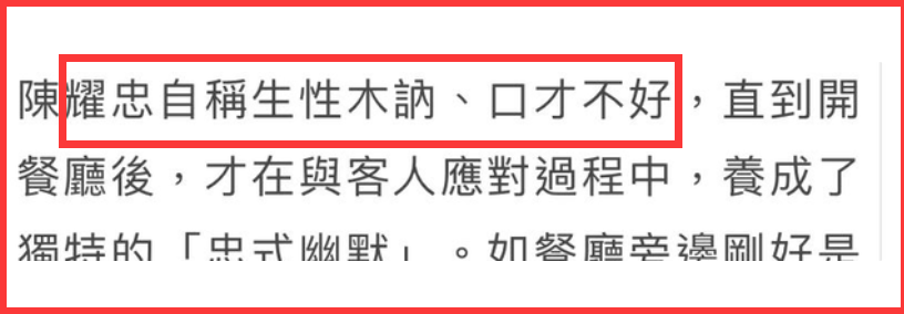 媒体说:陈耀忠曾说自己为人木讷、口才不好,直到后来开了餐厅,他的情况才有所好转,在与顾客的沟通交谈中,渐渐形成了自己的“忠式”幽默。