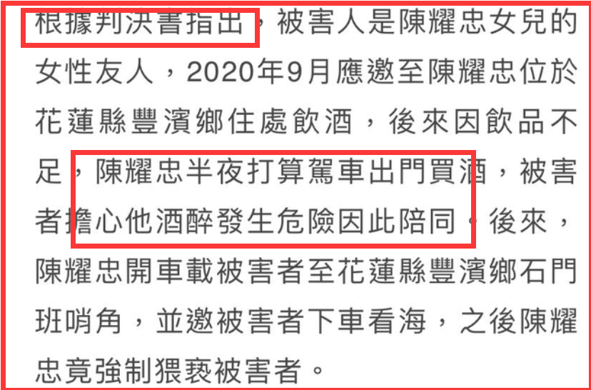 据媒体报道,事发时陈耀忠喝了不少酒,因为受害者担心他驾车安全,才会陪同,不曾想陈耀忠驾车到海边,邀请受害者看海,之后便强制猥亵了对方。