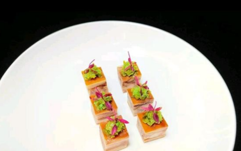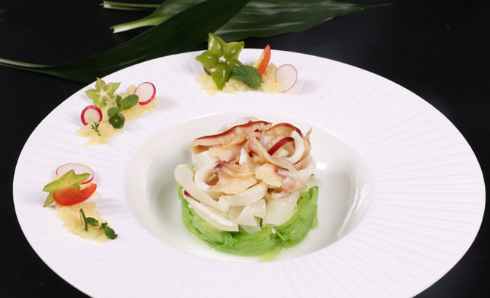 此菜运用后厨中最为常见的圆形模具,将清爽微苦的凉瓜、柔韧鲜美的鱼鳔和弹脆劲道的北极贝叠在一起,鱼鳔的白与凉瓜的绿、北极贝的红搭配起来和谐自然,这三种食材虽然颜色不同、口感各异,但却成就了这道宴席上的“小清新”,让人眼前一亮。