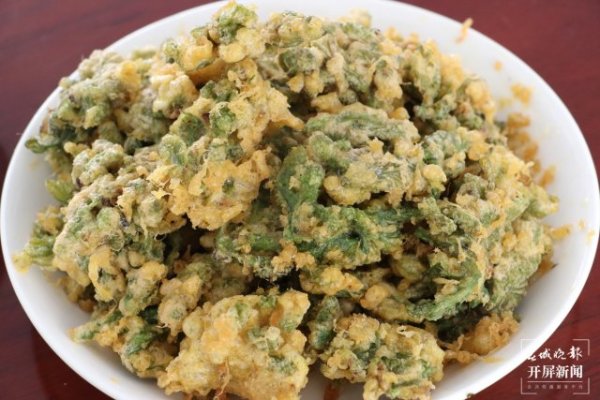 在刘大姐的菜谱中,最鲜美的要数烙桑椹花酥了。将漂洗好后的桑椹花和鸡蛋搅匀,加上少许面粉,放在油锅里炸,炸至金黄就可出锅。金灿灿的蛋饼中隐着翠绿的桑椹花,颜色清新,勾起食欲。迫不及待品尝,入口时微苦,随即满口清香袭来,鸡蛋的浓香配上桑椹花的清香,让人唇齿留香。