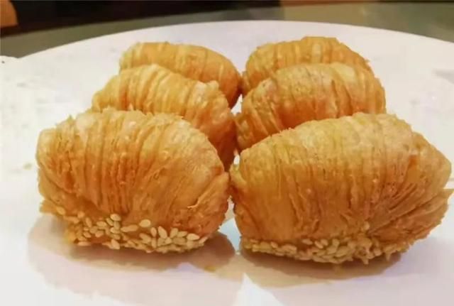 板栗酥是先将本地新鲜老板栗去壳去皮,蒸熟后,放入烤箱烘焙出板栗的香味,再把板栗打成粉末带点颗粒状,再包入开好的酥皮中,底部沾白芝麻,最后放入油锅炸至金黄色出锅装盘即可。