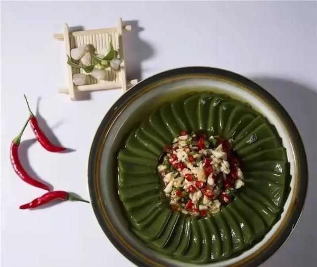 观音豆腐是用腐婢树叶制成,将树叶洗干净放入盆中,用手不停搓揉,就搓揉成满盆叶汁,通过沙布过滤,将树叶的筋络去除后,再往叶汁中点上石膏,就制作出绿莹莹、嫩生生的豆腐,再将豆腐切成小块,然后加入适量生抽、陈醋、蒜泥、辣椒搅拌均匀后撒上葱花的一道凉菜。