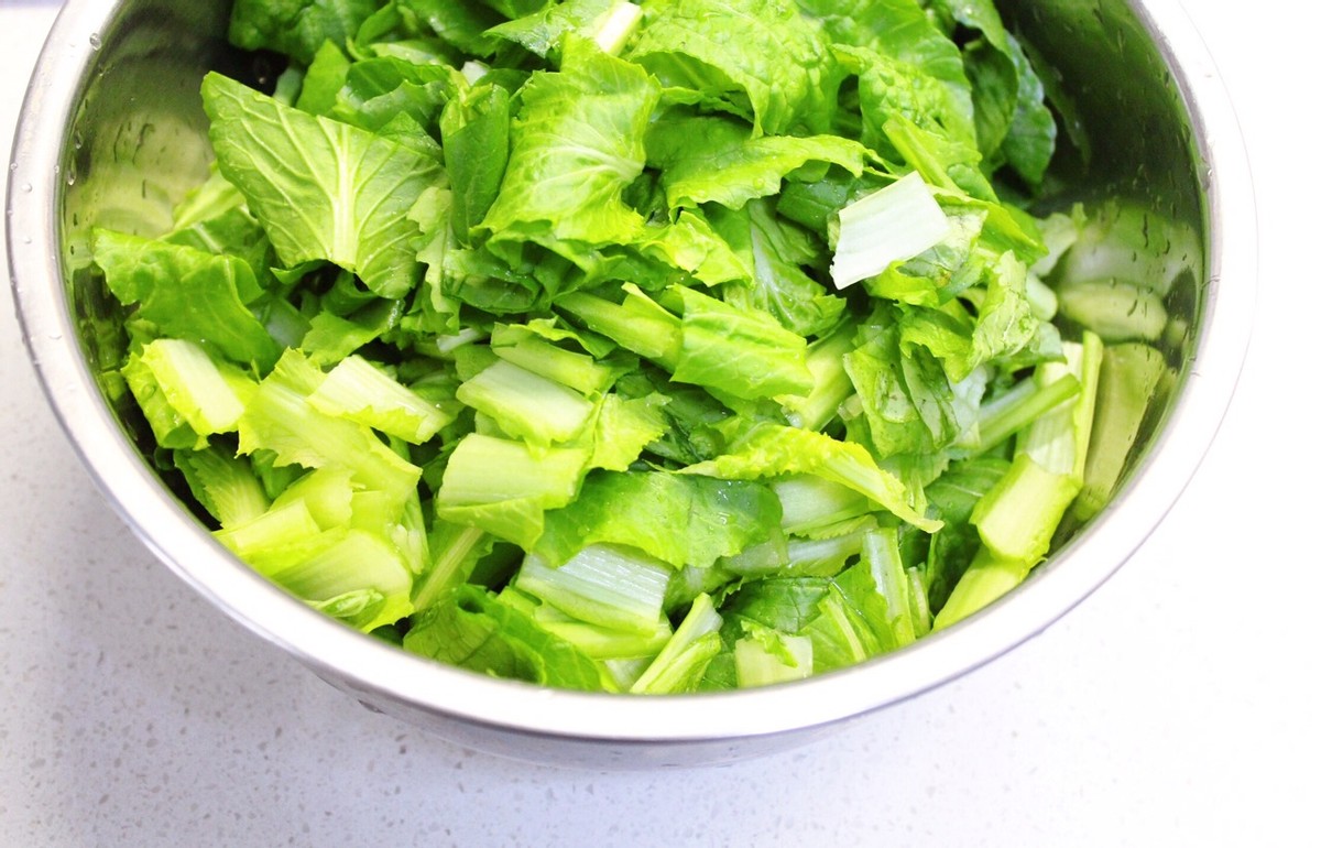 步骤2、小白菜去根后洗净,随后用刀切成小块,弄好后装盆备用。