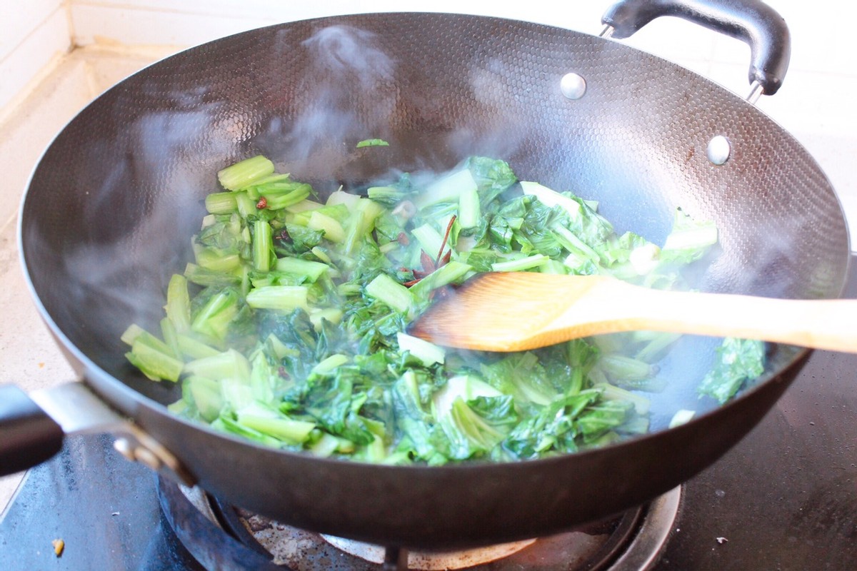 步骤4、重新起锅热油,下入花椒八角炸出香味,然后将小白菜倒进去不断翻炒,直到炒软即可。