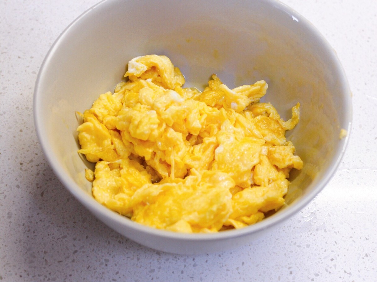 步骤3、鸡蛋打散,起锅热油,将鸡蛋液注入其中,将鸡蛋摊制定型后盛出备用。