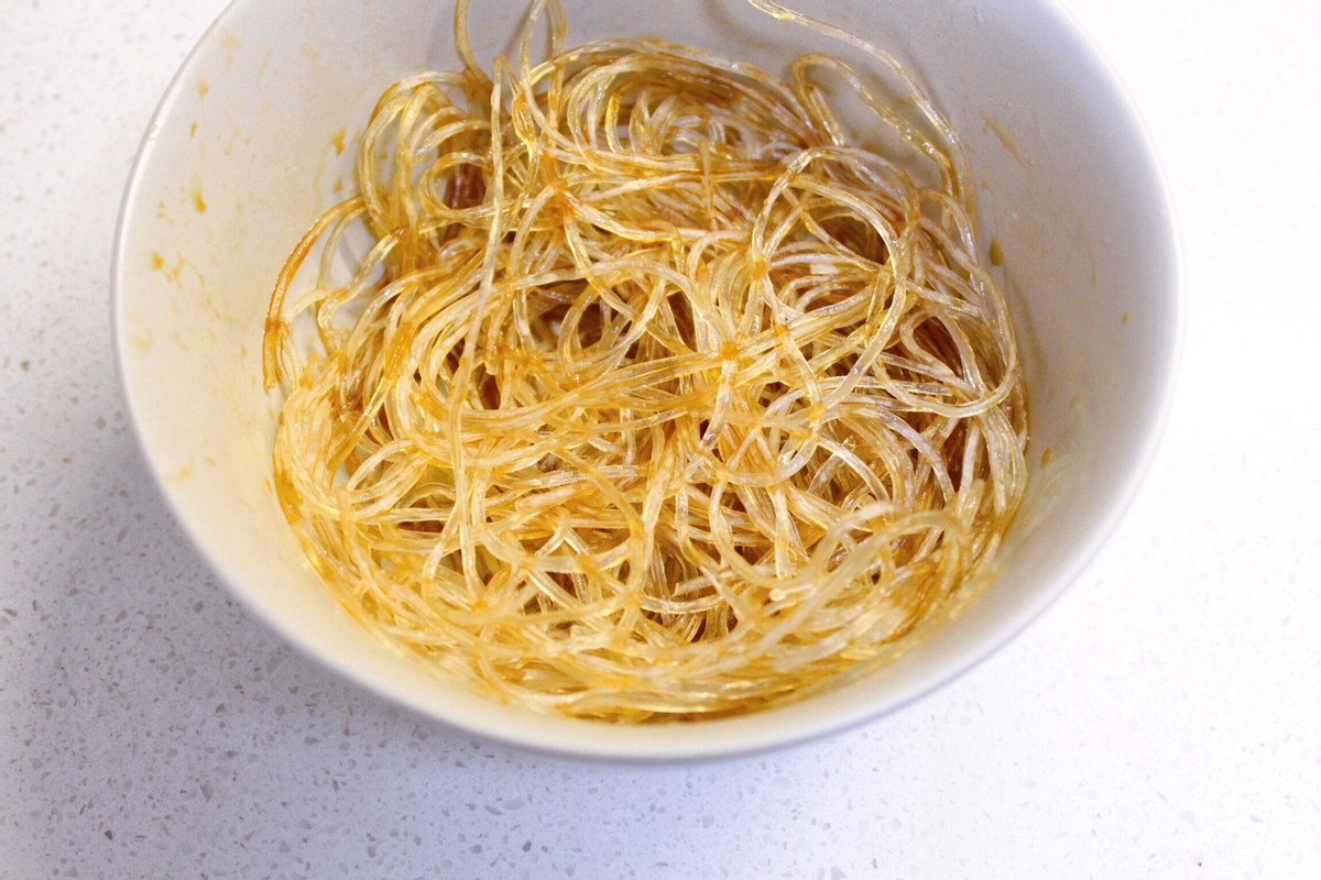 步骤1、首先我们将所有用到的食材全部准备好,然后将一捆粉丝洗净后,泡入到温水中,将其泡软,随后将多余水分倒出,添加适量老抽腌制一会。