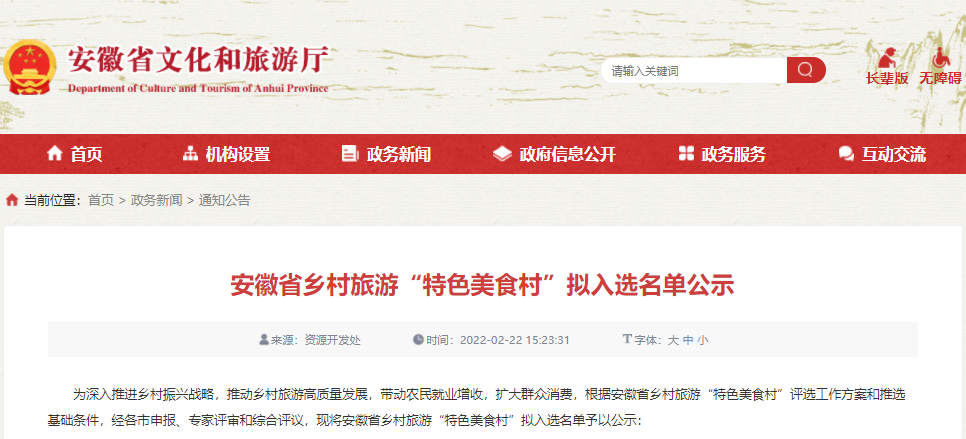 ↑网站截图为深入推进乡村振兴战略,推动乡村旅游高质量发展,带动农民就业增收,扩大群众消费,根据安徽省乡村旅游“特色美食村”评选工作方案和推选基础条件,经各市申报、专家评审和综合评议,现将安徽省乡村旅游“特色美食村”拟入选名单予以公示:
