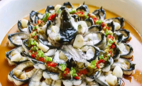 3、最后用葱油烧热,下入葱花和红椒末炒香,淋入河鳗鱼上即可出菜清蒸河鳗。