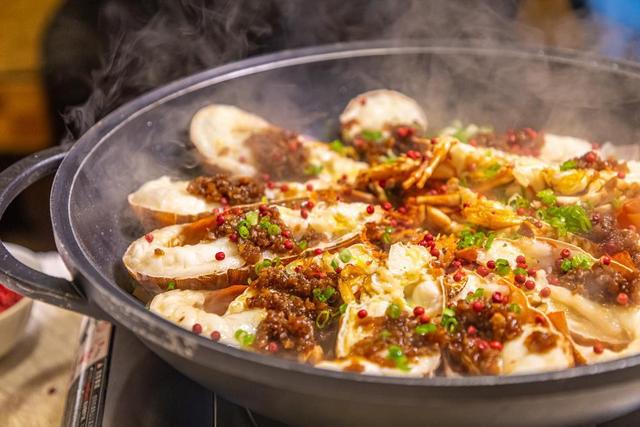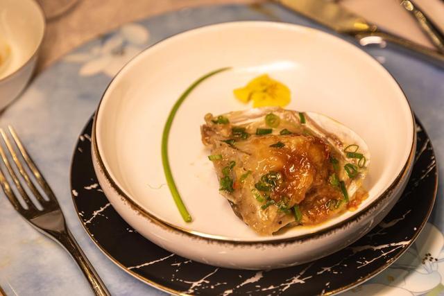 惹味酱焗大头鱼嘴加入了由番禺本地食材制成的酱料,值得一提的是,酱料经过多道工序熬制而成,酱香味浓厚而不咸口。据厨师说,将秘制酱料铺于鲜鱼头之上,猛火焖制,能呈现出丰富口感,让味蕾体验应接不暇。
