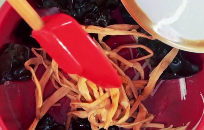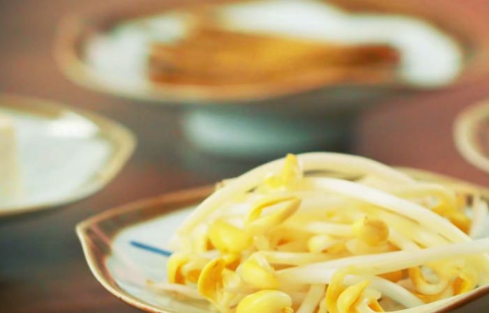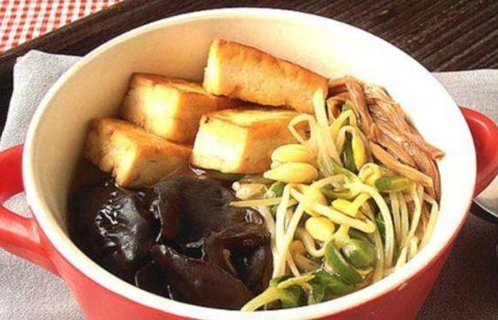【准备原料】:鲜嫩的豆芽60g,老豆腐80克,泡发好的黑木耳60g,预先泡软的黄花菜干60g,大葱丝和姜丝少许,两勺蚝油,一勺生抽,3g白砂糖,1g的盐和鸡精,一勺香油,少许的葱花。